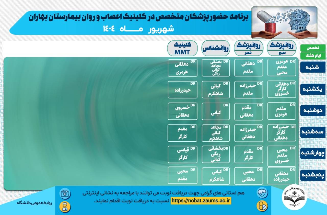 ���� برنامه نوبت دهی پزشکان کلینیک اعصاب و روان بیمارستان بهاران به صورت حضوری